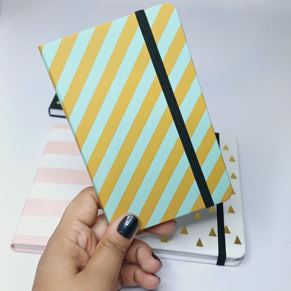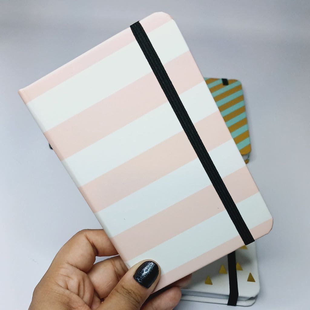 Cuaderno de tapa dura con 80 hojas rayadas y cierre con elástico.