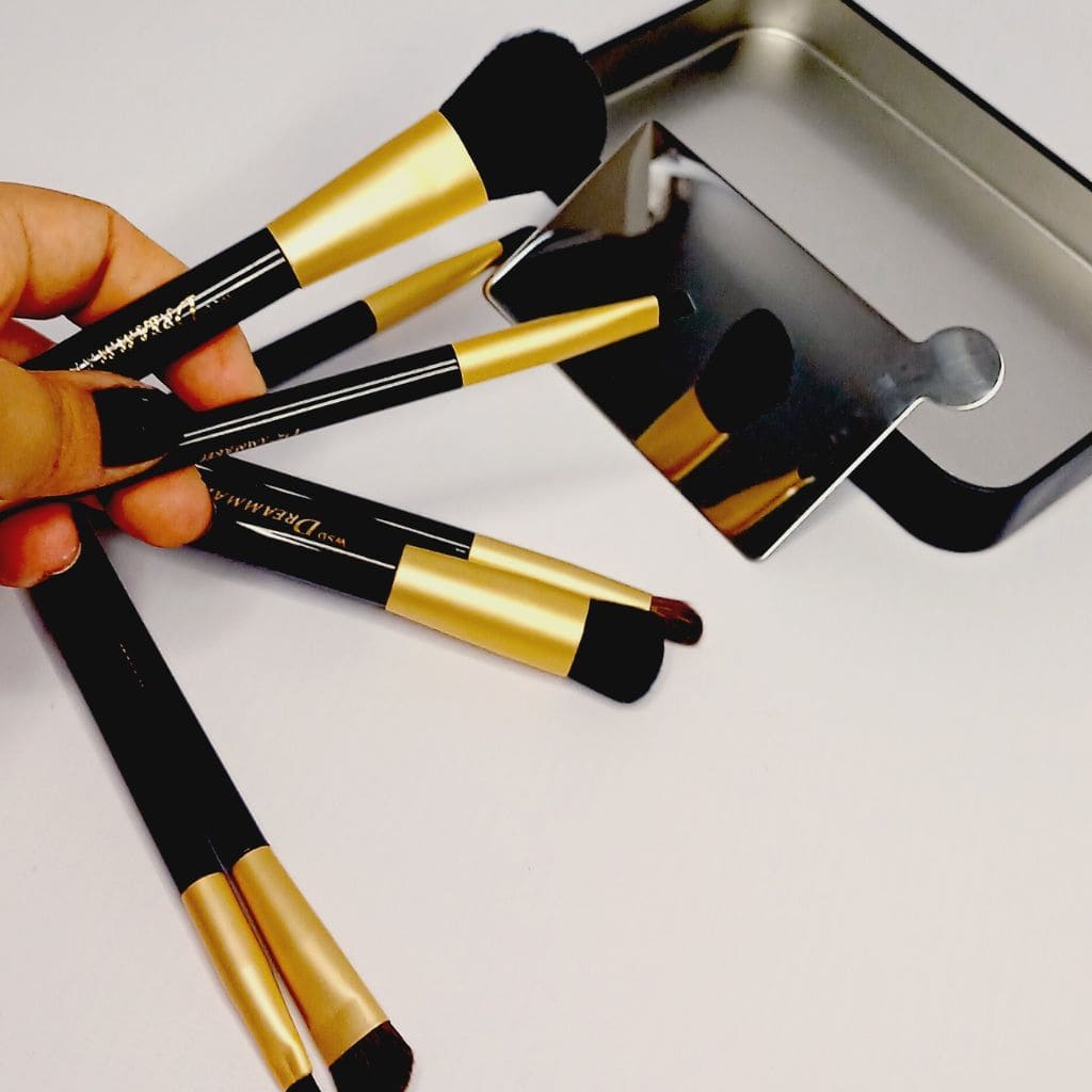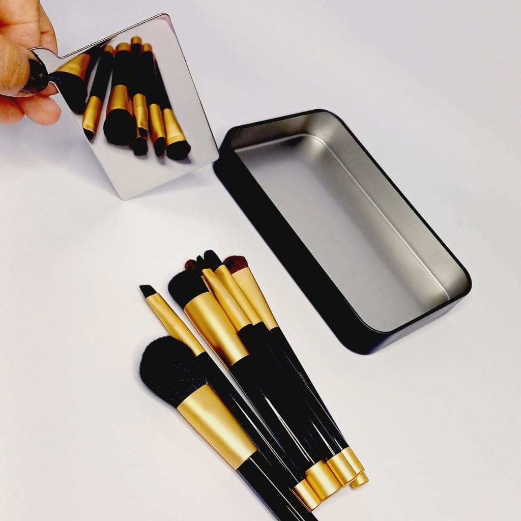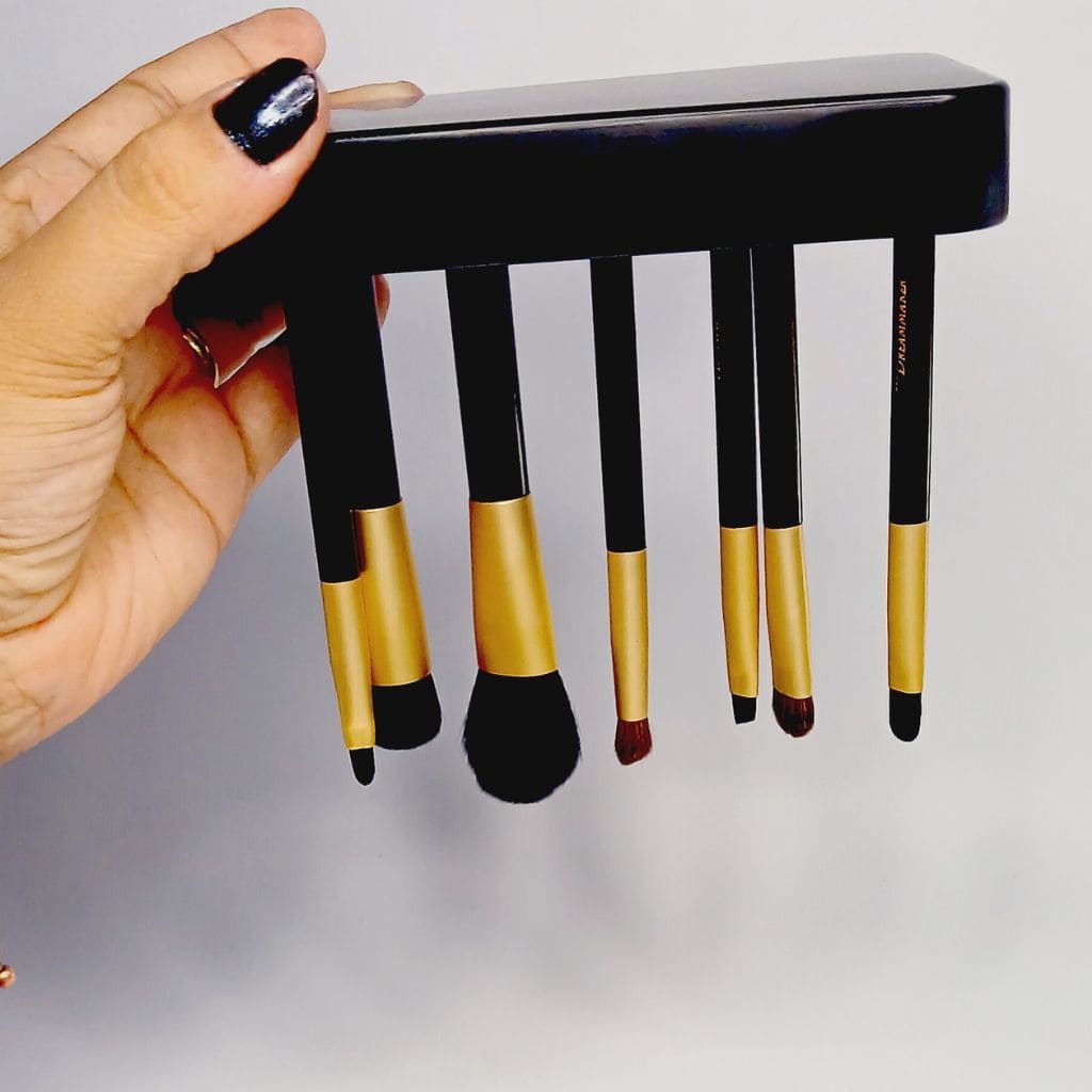 Cada Brocha contiene iman en su base para que se puedan mantener de pie sobre su propio estuche mientras nos maquillamos,.tambien sirve para dejarlas secando cuando las lavamos.
